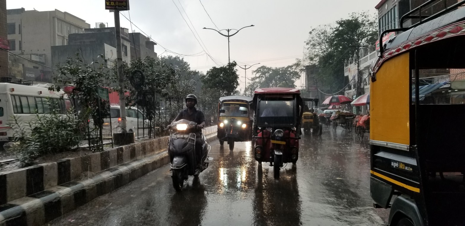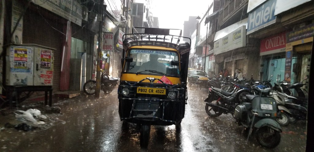 Another adventure began in the pouring rain, four of us jammed into a two person tuktuk for a negotiated 100 rupee ride. Elbows hanging out for the two on the edge, the ride was going to be uncomfortable, and wet. The windshield wiper was not working for the driver as he hunched forward, squinting through the streaking water, inching through the jam. His counterpart stopped us, shouted there was a mistake and offered us another two person tuttuk for 200 rupees, but this one had flaps. For perceived safety sake, we switched vehicles with two on the seat, two facing backwards sitting on the edge of our drivers seat. Heavy rain and flooded streets, doused by waves of water from passing cars, our minute chariot driver raced to our destination, himself soaked. He turned into our guest house, the entrance flooded with five inches of water. Honking incessantly, the gates were finally opened and we were able to depart on drier ground. We paid him an additional 100 rupees.