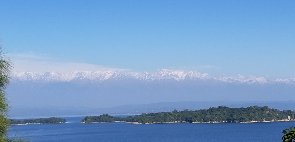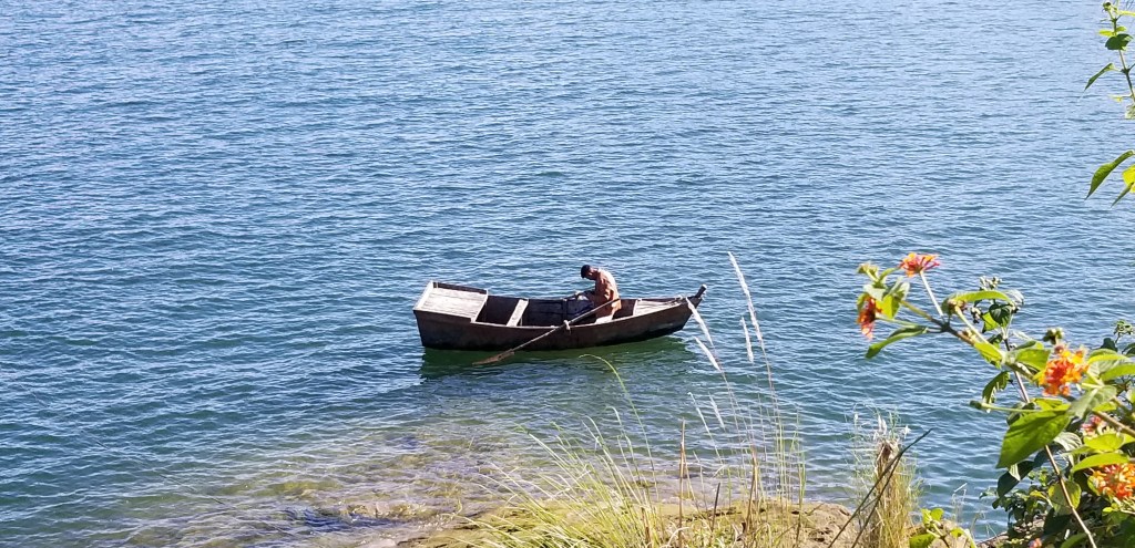 As the morning grew, the prospect of a beautiful day became clearer. Normally during this quiet time I indulge myself with some reading, accompanied by a few cups of coffee. I decided to forego the last one and take time out from the next chapter of my book in order to drink in the warmth of the oncoming day. To the top of the main building I climbed, careful not to slip on the dew wet stairs, where the three quarter moon hung in the western clear blue sky and the rising east sun was beaming it’s welcome rays. The mountains in the north were clearer than any day so far, providing a painted backdrop to the lake’s green islands, while wispy clouds decorated the southern sky. For the first time this week, the cock trumpeted almost in time with the early morning music bouncing off the waters from across the bay while a flock of birds streaked through the picture.