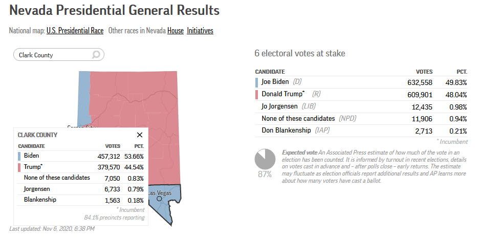 What a novel concept. As a citizen of the Nevada you don’t have to spoil your ballot or hand it back to the scrutineer as a protest against all the candidates; rather you can check the box, “none of these candidates”, so the choice is officially recorded. Indeed, Jo Jorgensen, who was born in Libertyville, Illinois (clearly destined to be a Libertarian) was behind “none of these candidates” in several counties including the largest, Clark County which encompasses Las Vegas. I expect her message was deemed to be as unappealing to 7,050 voters as was Trump’s and Biden’s.