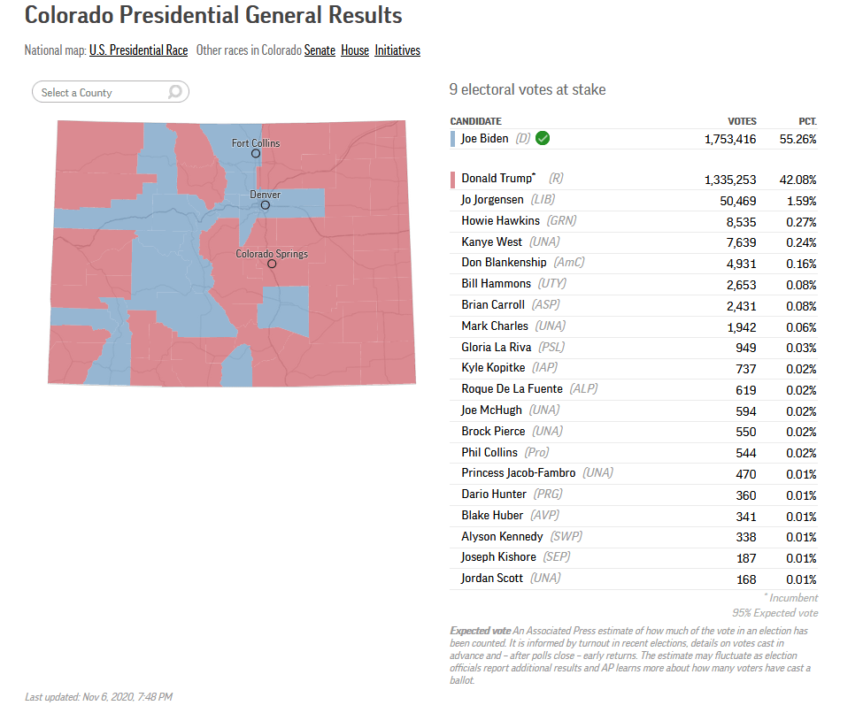 In order to win Colorado and Vermont, Kanye would need to accumulate more votes than 20 other candidates on the presidential ticket. Aside from Trump and Biden and Jorgensen and Kanye, there are 17 other people who are vying to be president of the United States. The names are not identical on each list so the number of contestants is even higher. Zachary Scalf who has thus far managed 31 votes in Vermont is not on the list in Colorado. Good thing because he probably would have fared worse than Jordan Scott, last in terms of number of votes there with only 168.