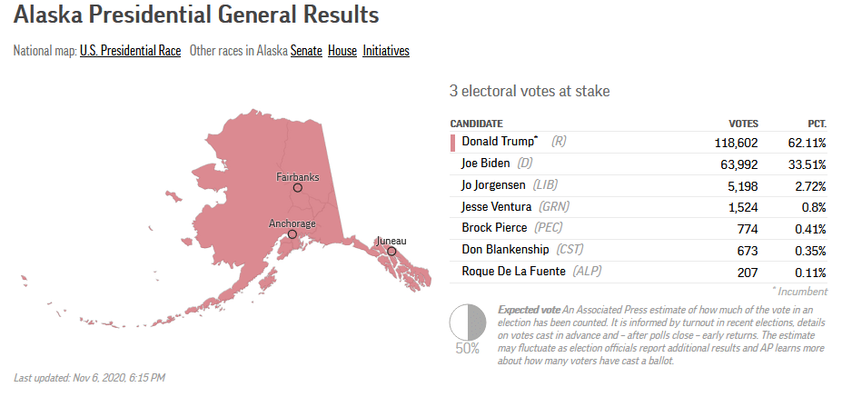 What of Alaska? The numbers have frozen. An update check at 2:30 pm today shows not a single digit has been changed and Trump’s 62% of the counted ballots remains still “too close to call”.