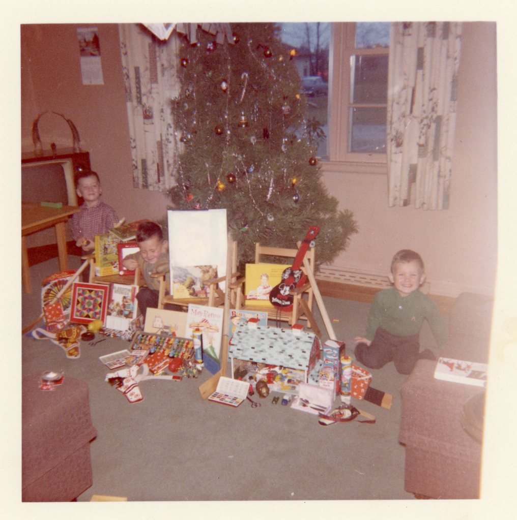 I stumbled on this picture from 1965. From left to right, in order of age, Gary, Henry and Peter. Michael was an infant, just born in the late summer. The tree was real, bought from a man encamped in his trailer parked in the Woolco lot, spiritedly negotiated to it’s lowest agreeable price, nailed to a wooden Coca-Cola crate and propped in front of the living room window on Kostis Ave. I don’t recall this particular Christmas although Gary reminded me of the chairs and the accompanying table. It was part of the gift for the three of us; we were positioned beside our haul for the photo. The quality of the image limits the zooming capabilities in an attempt to identify some of the bounty; nevertheless, humorously, one cannot help but notice how a number of the presents came in threes: a box of Cracker Jacks; a paint set; a holster with a toy gun; a balloon pump; a hockey stick; and, a piggy bank. Clearly, our parents were encouraging us to be savers.