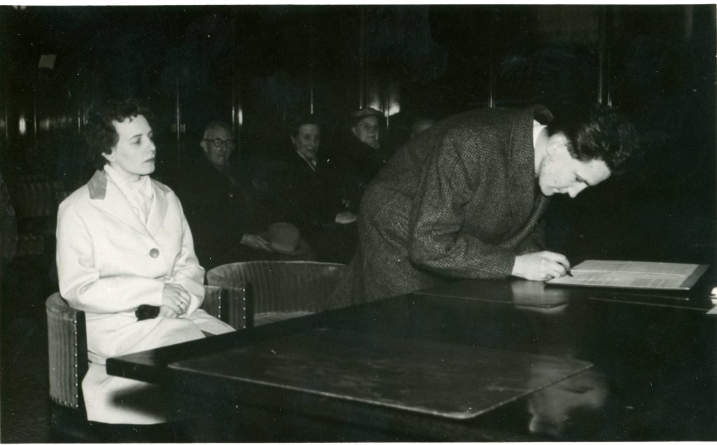 The four photos in my parents collection documents the moment as if an official record. One shows an officer of the city, suitably dressed, standing behind a simple desk in a meeting room with rows of chairs, presiding over the pronouncement. There are two pictures, one each of Mom and Dad signing the document. And finally a fourth one of another civil servant handing a copy to the newly married couple. There are no smiles to be found. My Dad’s face is expressionless; my mother looks scared in two of them.