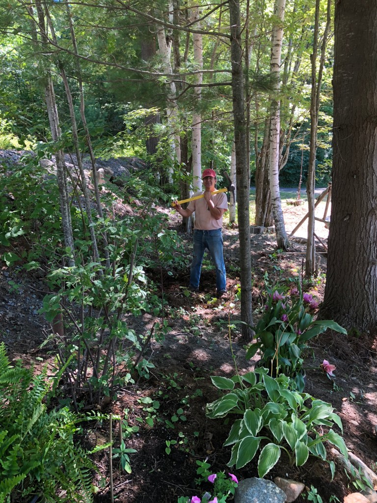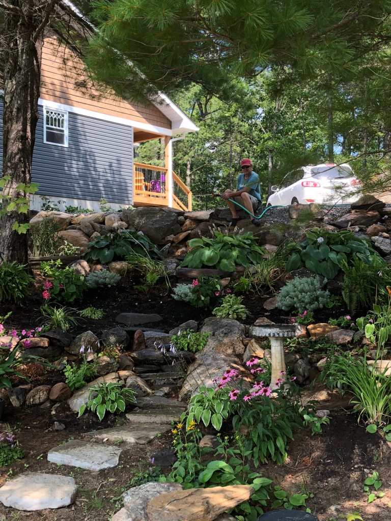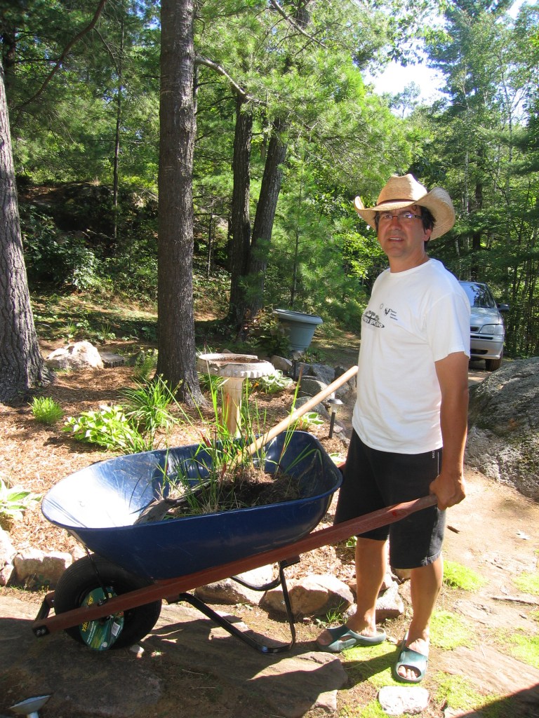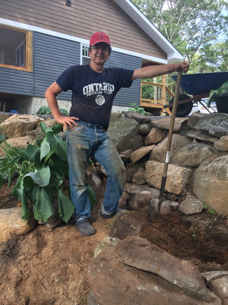 The spring and fall are the most opportune times to spot prospective boulders when the lack of vegetation reveals their existence. I walk the cottage access road assessing the viability of transporting that beautifully round, pink piece of quartz because it would fit perfectly into that new corner just built. At the end of our driveway is a motherlode of possibilities. If I can dig underneath and pry it out of the ground with the shovel, then it is mine. When I realize the protruding piece is really just the tip of the iceberg, then I find myself wishing for a little Bobcat.