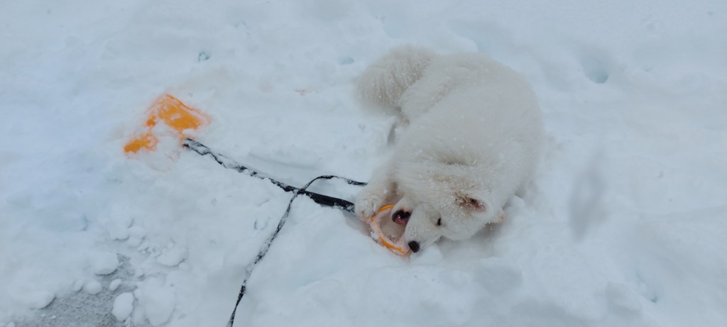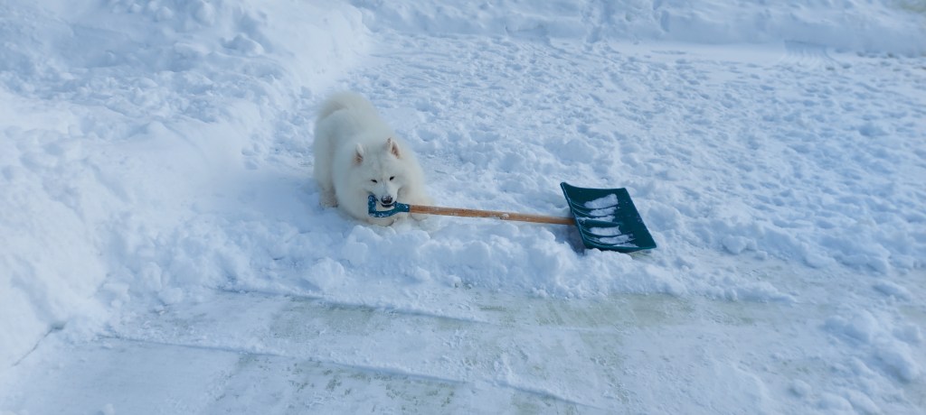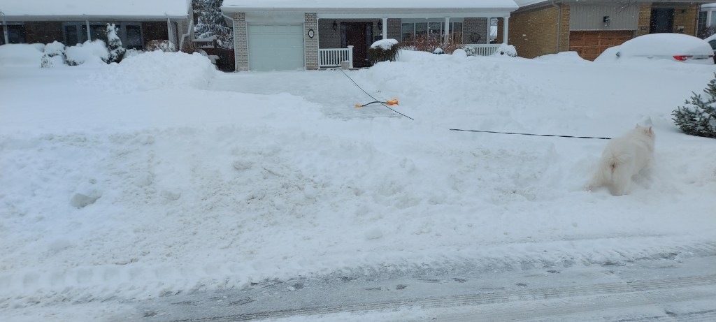 Toronto received what felt to be a full winter’s equivalent of snow in one day. Add the pile from the sidewalk plow and the road tractors and you have a morning and an afternoon of pushing, lifting and throwing hip’s deep snow piled ever higher. Our dog, Odin, accompanies me on these ventures. He gets his own shovel although he still has not grasped the concept, preferring to gnaw on the handle rather than endure the strain of dragging a load to the side.