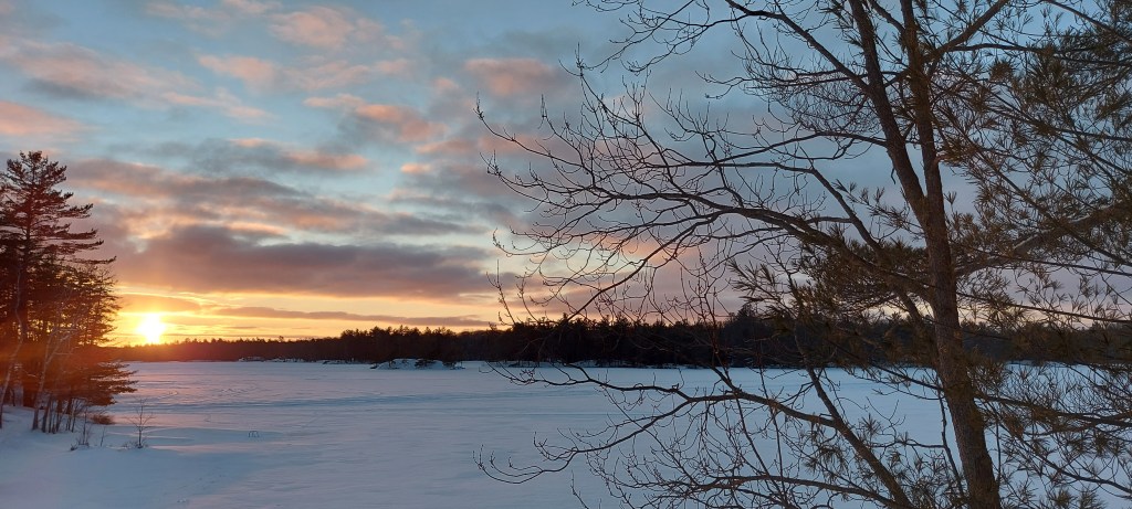 “There is no such thing as bad weather, just bad clothing” or simply relying on the advantages of youth to ward off the cold. We aren’t young anymore so attitude and a warm attire have become our saviours. Olga and I woke to -27 C yesterday morning and proceeded to don our snow pants and assorted seasonal accoutrements to embark on Odin’s daily constitutional. The air was clean and fresh, the sun was shining. It was glorious. Last night was peaceful and calm as Olga and I followed the cottage road without a flashlight, led only by the brightness of a full moon on the white snow, kept company by the crunching beneath our feet. At one point we stopped and drank in the silence, gazing at the constellations. Today I skated on my ice rink, stick handling around Odin, raising my arms in jubilation after an imagined goal. We ended the day relaxed on the bench, quietly breathing in the beauty of the lake.