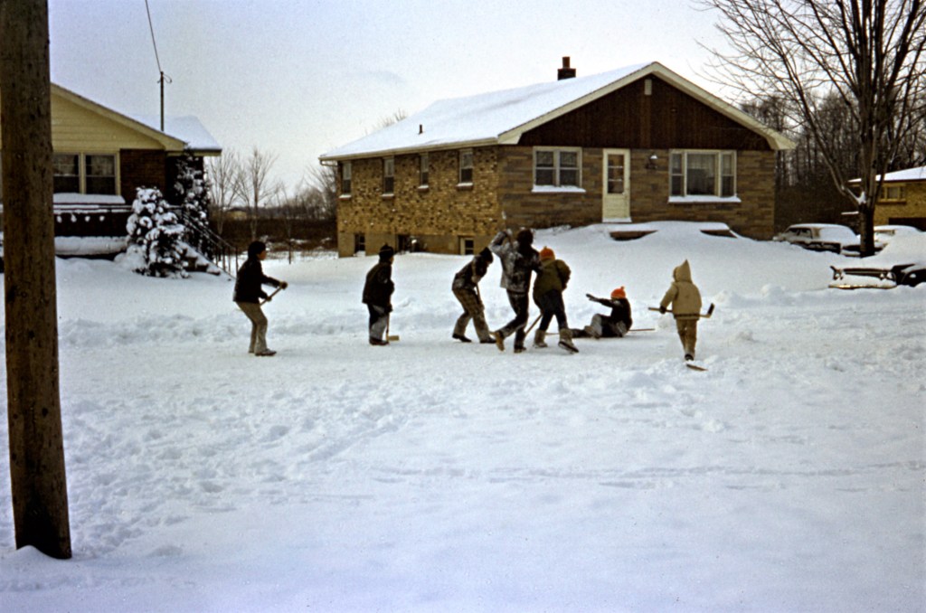 I don’t recall being hindered by the snow. The cost of downhill skiing and organized hockey eliminated our participation. We found other avenues: tobogganing, forts for snowball fights, backyard ice rinks, or trudging to the frozen creek. The latter two activities meant work in preparation, warming us up for the fun itself.