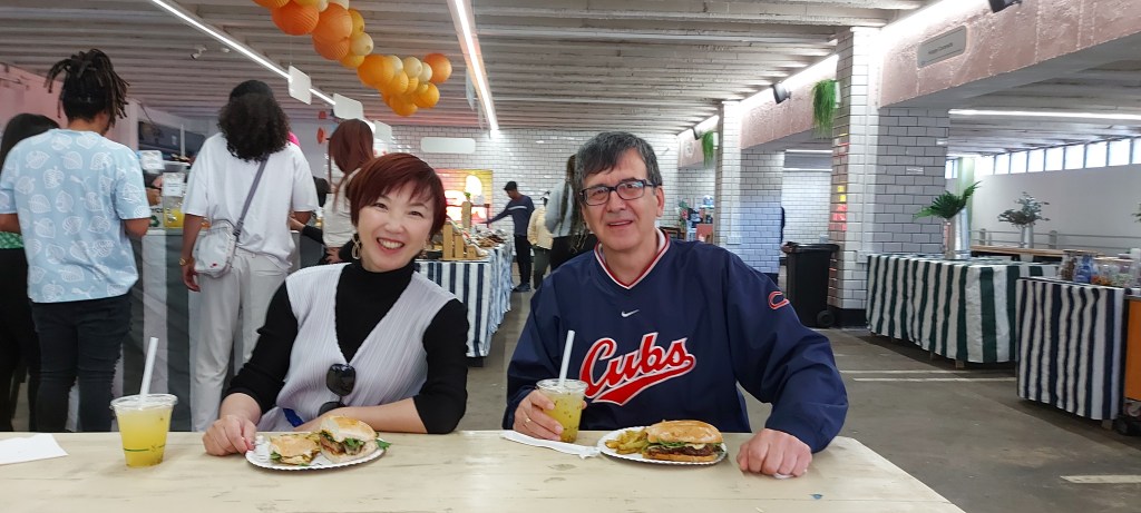 The Uber driver let me off at the requested address, a twenty minute ride from the hotel. I recognized the building from the website and eventually found the entrance. Greeted there by a jovial black man and a young white woman providing guidance, I inquired about food, asking for their recommendation. Both immediately pointed to the Argentinian stall serving the most delicious steak sandwiches. I sat with my order at a nearby table and engaged in a conversation with a couple originating from China who have lived in Johannesburg for 17 years. The crowd at the Playground consisted of white tourists and South Africans, checking out the wares, marveling at the variety of food, enjoying a drink, bouncing to the beat of the DJ, absorbing the warmth of the sun on the wrap around balcony. It is a hub of diversity and activity.