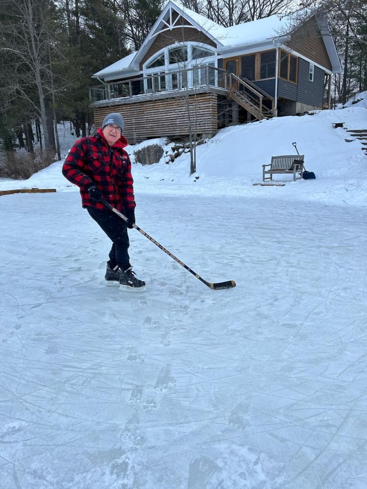 Olga, my loyal and faithful fan, ventures out to her seat, quietly cheering, laughing at the antics, commenting that the ice looks good. The scene is idyllic. Snow blanketing the landscape, gently fluttering from the sky, the serenity of winter morning interspersed with the sounds of pond hockey on this Canadian morning.