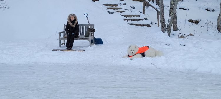 After an hour the game is over. Olga has since returned to the cottage to get breakfast ready; Odin is ensconced in the snowbank on the sidelines, knawing on the spare puck. The first skate complete, hot oatmeal and some pure maple syrup awaits.